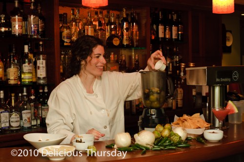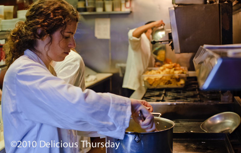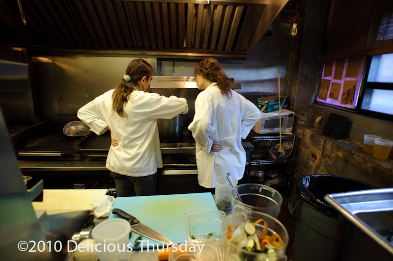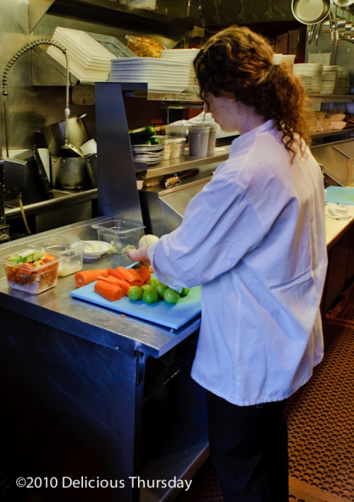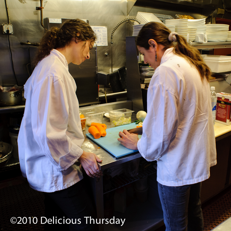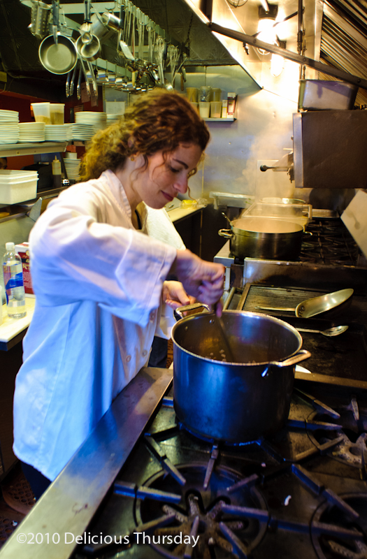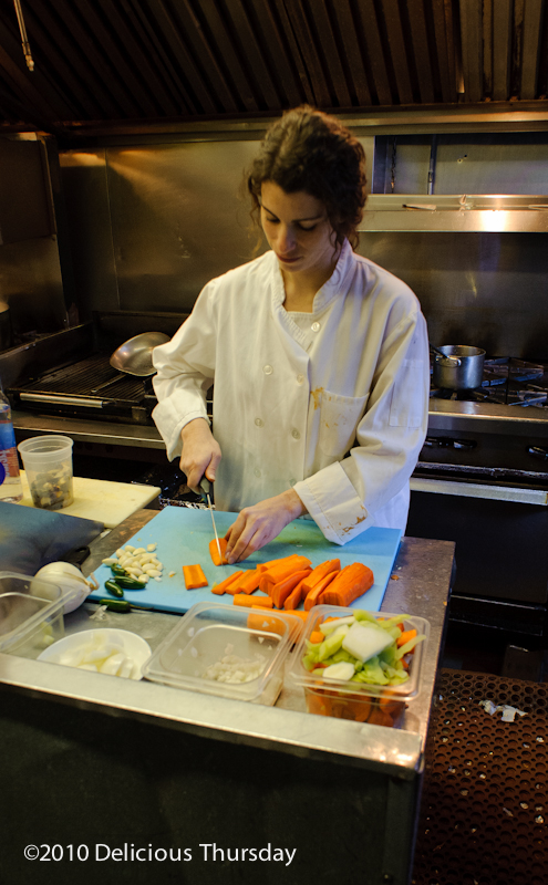As the dinner service is winding up, my night is winding down. I pop into the kitchen one last time and already the pace is at lightening speed as plates of Avocado-3-ways, Tamarind Glazed Hanger Steak and Halibut, Halibut, Halibut come flying past me. Sue is right in the thick of the battleground expediting orders and making sure everything is timed to perfection. I sneak one last bite of the leftover Vegetarian Chili before heading out the door and I begin to think about that great big pot filled with beans, vegetables and hard work.
