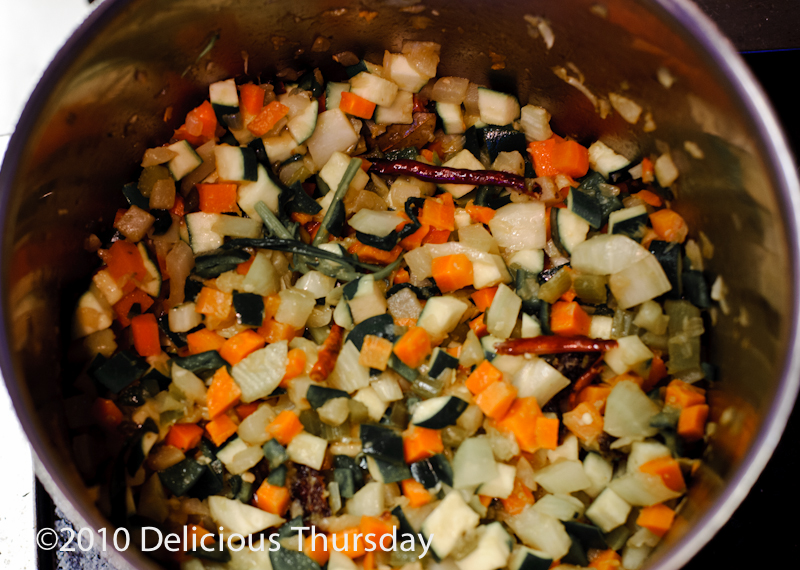 So with a corrective cooling measure in mind, we add some sweetness to combat the spice – more carrots, celery and some beets (both pureed and in solid form) seem to do the trick. Sue feels strongly about not adding sugar to get the spice to surrender – she thinks there are more natural and healthy ways to add that sweet flavor back. So we add that to the pot and we jot it down on the recipe. Quick thinking as she is, Sue remembers to fish out those chilis – making sure they don’t continue to turn the heat back up. And we document that step as well.