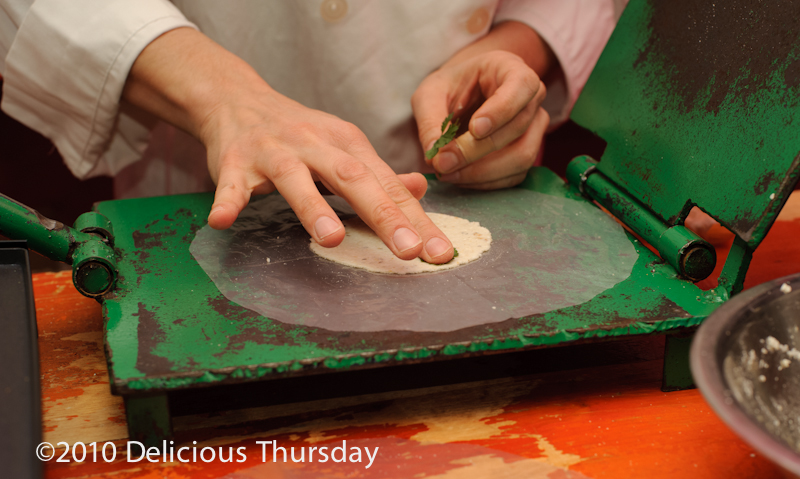The lights come down low. The 5 orange lanterns above the bar begin to twinkle and tease as they draw the crowd away from the drafty door and into the main dining room. I’m not sure which casts a more powerful spell on our diners: drinks like Suzy’s Smokin’ Margarita cocktail or Nick, the scruffy smoldering bartender who mixes them. Jorge hits the music. The hot pink painted wall is illuminated. The bright blue bar stools stand ready to comfort our thirsty guests. And the action begins. Alisia stands in the corner of the restaurant on a raised platform stage as to highlight the star of the show: the fresh corn torillas. The theatre is alive and well in New York. And broadway is no match for the show at Suenos.