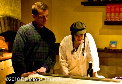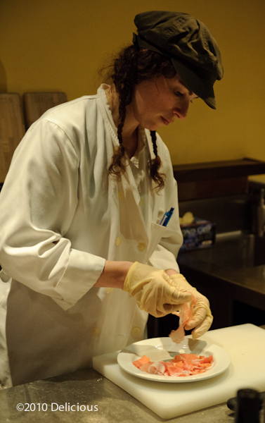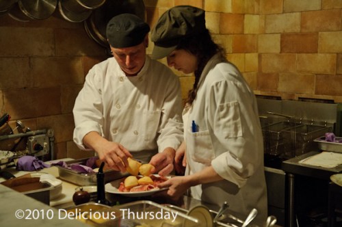 Presentation matters: Marc Levinson & Amy Bandolik arranging the Gnocco Fritto on the plate with the Prosciutto - Photo by Sandy Hechtman - sandyhechtman.com