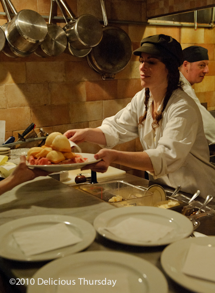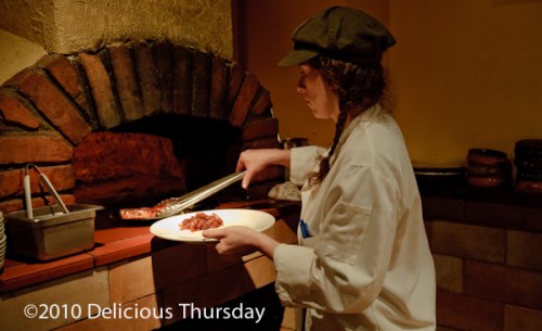 Moments later, some friendly faces prop themselves up to the Chefs Bar. Watching their meal be prepared makes it all the more meaningful – for us and for them. Appetizers of Arancine, Polpettine and Mozzarella di Bufala fly from the kitchen. The couple at the bar chooses the Il Polletto – the de-boned young Chicken with Italian Herbs roasted in the Brick Oven with Fennel and La Costoletta di Maiale al Forno – the Pork Chop (also) roasted in the Brick Oven with caramelized Onions.