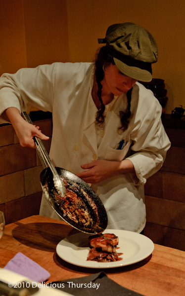 I pour a drizzle of olive oil on two silver sizzle plates and slide the plates deep into the hottest part of the oven. My hand instantly turns red and remains that way the rest of the night and into the morning. I prepare the meat (one pork chop and one baby chicken) and place them on to the metal plates – being sure to coat the sides and all the edges with the sizzling hot oil. Sparks are flying (and not of the romantic variety) and hot oil is splattering everywhere. Liza seems cool and unaffected while I am ducking for cover and shielding my chef’s coat from going ablaze.