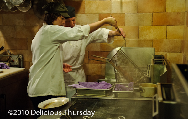I gently swirl the slices – eight in all – around the edges of a small white place and step over to the fry station to quickly deep fry and plate the crisp doughy bread pockets. In a flash the pockets rise to the surface and the dough is done. At the table, our diners tear open those bread pockets and fill them with the newly sliced Prosciutto. A better sandwich has not been born.