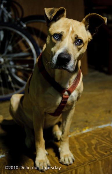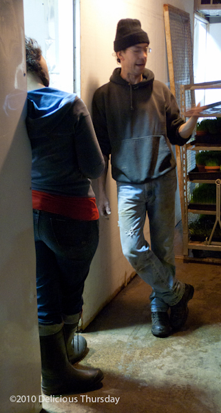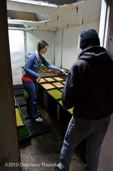We load the wheatgrass trays into a room where misting water gently coaxes the grass to grow. This is a true urban farm: no greenery in the ground – just tabletop growing at its best. The space is an eclectic mix & match of parts much like my canine friends (Sam is a lab/chow and Sascha a pit/husky). The floors are a grey cement, the walls are brick with a messy mortar stacked in between and the garage doors are a moody blue. The space is dark and shady and filled with soil and dirt. The only brightness comes from Stewart’s quirky smile and the shiny green blades of grass starting to peek their way out of the soil.