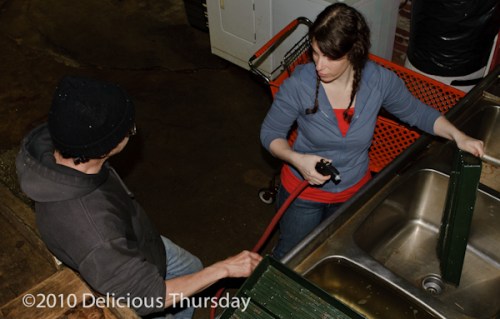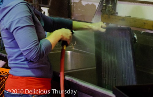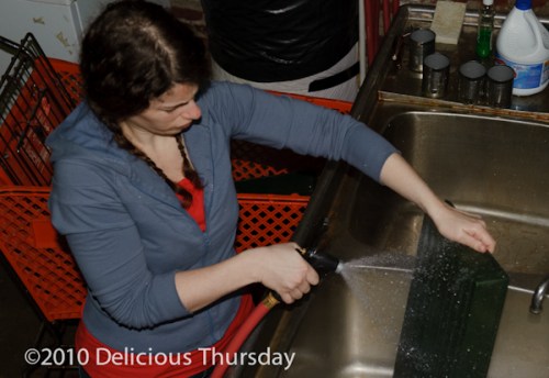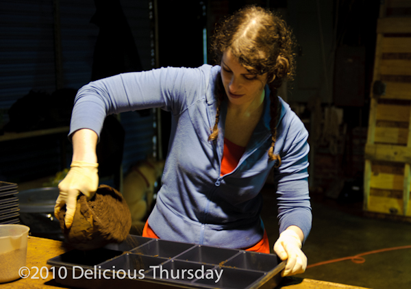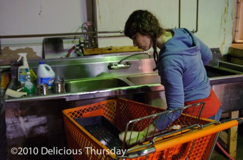 I start by standing over a large stainless steel sink and scrubbing hundreds of plastic containers to prep them for planting. After dousing the plastics with a gunshot stream of water power I load the trays into the bright orange shopping cart.  The cloud of condensation surrounding me feels more like a ride on the Maid of the Mist than a day on the farm. My rain boots are the only thing protecting me from the flood forming beneath my feet. I am soaked.