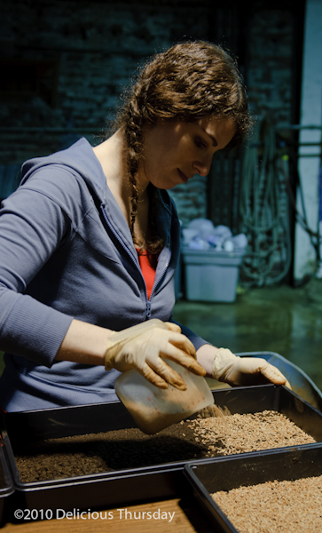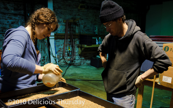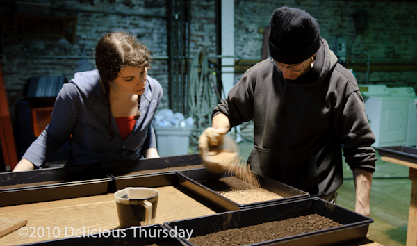 Stewart guides my hands as I gently sprinkle the wheat seeds in a circular motion atop the soil. I am shocked and surprised at how difficult it is to evenly seed the soil. On my first attempt my tray suffered from empty spaces and steep summits. Stewart keeps my spirits high with a series of jokes (a priest and a rabbi walk into a bar…) and stories about his urban farm (this space actually used to be a coffin factory). After a few tries I start to get a feel for it. The seed bucket becomes an extension of my hand and in one circular motion I start to evenly seed the soil. By the end, my 10th tray, I can close my eyes and still have a lay of the land.