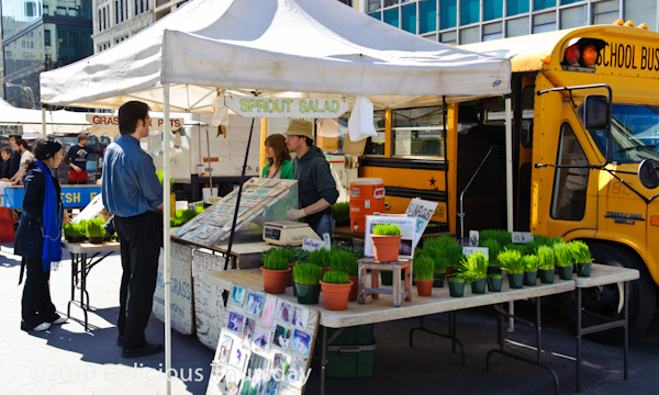 After a week of waiting, I find myself soaking up the early spring at a packed farmers market in Union Square. I wander over to the crowd formed around the yellow school bus just off Union Square West. I make my way to the front of the pack and see Stewart’s smiling face and sinewy frame. A welcome sight. On the table between us are a series of pots of wheatgrass that have grown 6 inches in height and are sparkling in the sunshine.