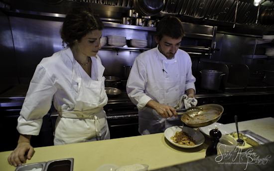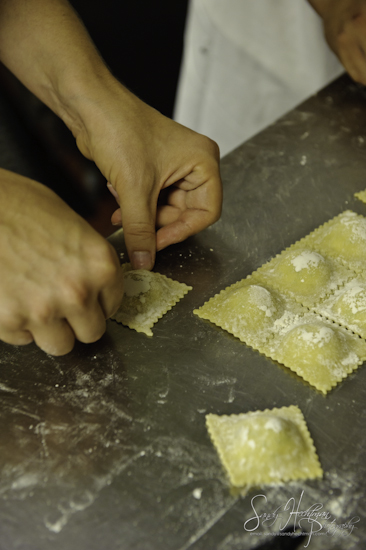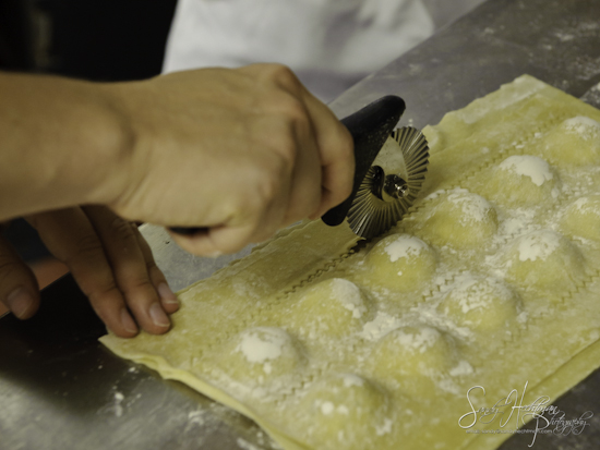 We pinch and seal each side and roll the fluted pastry wheel (also know as a ravioli cutter) along the edges and between each piece. My unsteady hand seems to snag the ravioli ending in an uneven and imperfect pocket. Humberto corrects my work and guides my hand along the way. Making pasta is a delicate dance – a tender twist as I try not to tear or tug the soft sheets of dough. At the end one of session – we have only 12 raviolis to speak of. We’ll need many more if this dish is on the menu tonight. I’m losing hope in my pasta prep but Humberto and I continue to work side by side and make some more. Each little pocket is looking better than the one before: the filling is just right, the sides are sealed tight and the perferations are now perfect.