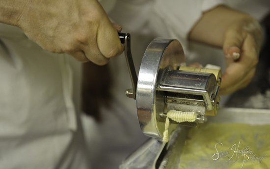 Humberto and I continue with Cavatelli. We slice our pasta dough into a long sections about 1/3 of an inch thick. After a quick lesson, I begin to roll the dough gently through the italian imported cavetelli maker and spin out a series of shapes that are ripe and ready to be joined with broccoli rabe. This task is remarkably easier than the one before. And while cavatelli is traditionally made by hand (think southern italian or sicilian grandmother cooking in her home kitchen) I have a newfound appreciation for the tools of the trade.