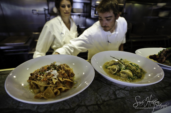 After my lesson in libations, I turned my attention to Greg Pollio for the final phase of my cooking class. Greg, the former student of ornithology (think birds) and herpetology (think reptiles) turned Sous Chef, guides me as I plate my well-made papardelle. Greg’s study of the sciences makes him a master in the kitchen as he teaches me about the subtleties surrounding pasta shapes and their contrasting cooking times. My pasta hits the hot water and hovers there for mere moments. All the while I am sauteeing Greg’s braised lamb bolognese and seasoning it with white wine and mint while my pasta cooks for what seems like a split second. Before I plate the papardelle I stop and perform my most important task: The taste test. I bring the sauce straight from saute pan to the spoon and into my mouth before it ever reaches the dish. There is nothing quite like that first forbidden kitchen bite – and the assurance that you did everything just right. Greg’s bright eyes, even brighter smile and his easy and natural way around the kitchen make you want to take him home along with your leftovers. If you visit Centro Vinoteca I’m sure you’ll agree that Greg only adds to the atmosphere inside. And I’m doubly sure you’ll understand the sentiment: Thank you open kitchen.
