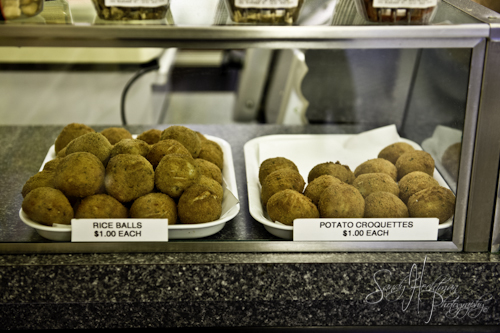 Carefully sidestepping the considerate compliments from Faicco’s baby-blue-shirted cast of lovable characters, I immediately go to work– hoping my rice ball creation will revive my fortune. I walk past the display cases filled with Pork Chops and Pinwheel Steaks and skip over the shelves lined with everything from anchovies to artichokes and escape to the secret space in the back of the shop. As I round the corner I get a glimpse of the coveted rice ball propped up like a pyramid behind the old-school-style sign. I only hope my rice ball preparation will yield equally appetizing results, and provide a little luck to spare.