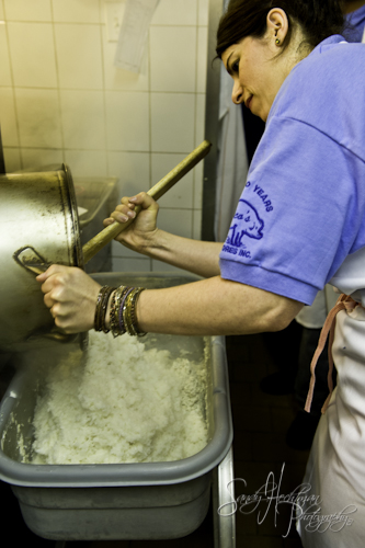 Faicco’s sells nearly 600 rice balls on their busiest day so I’ve got 600 chances at salvation. I have no time to waste. Eddie advises me as we combine our cheese-lovers trifecta of fresh ricotta, chopped mozzarella and grated romano. We mingle the mix together and add a sprinkling of seasoning: salt, pepper and parsley. Next, I suffer through the long process of laboring over 10 pounds of long grain carolina rice. Julio and I keep the flame low and the mixing to a steady speed. If we burn the bottom, our entire pot of rice is ruined and we’re all out of luck. For 15 minutes we steadily stir as each turn of the wooden paddle becomes a struggle to complete. Our only saving grace is the timed 10 minute break while we wait for our rice to thicken. Julio and I return to our mixing madness, combining the cheese trio with our ready rice. Eager to glean some luck from each grain – and while Julio isn’t watching – I sneak a taste as I bring the fantastic formula into the fridge where it will cool and become ripe for rice ball formation.